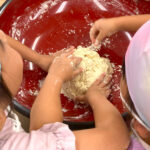 麺を足踏みする時は親も一緒に全員で手拍子をしながら「おいしくな~れ!」と掛け声をかけてふみふみ。