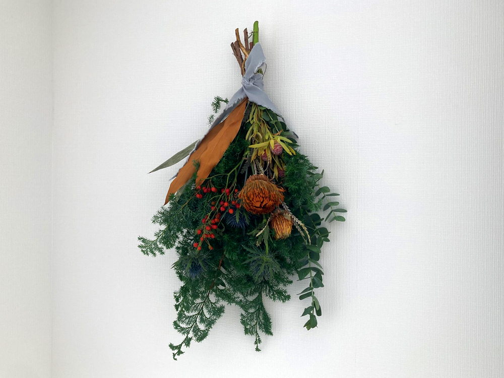 こういう「花や葉、実などの植物を束ねて壁にかける飾り」のことをスワッグというそうです。
